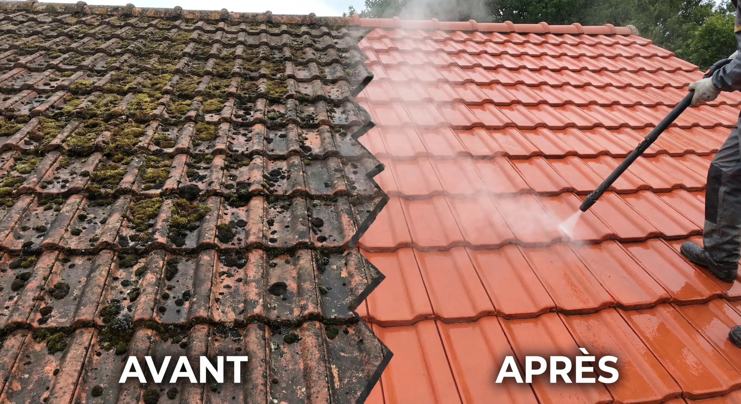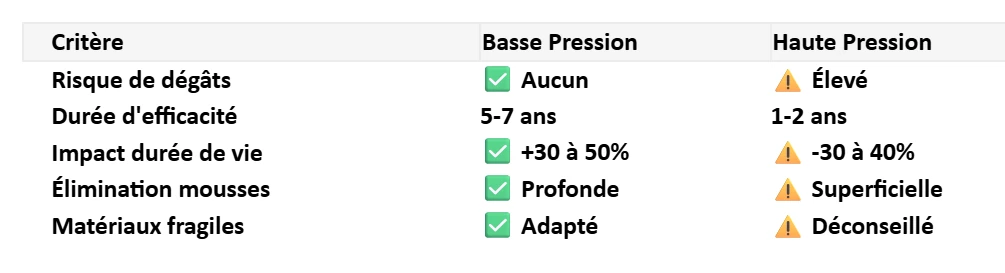 Le nettoyage haute pression (karcher, 150-250 bars) peut sembler efficace, mais il représente un danger majeur pour votre toiture :